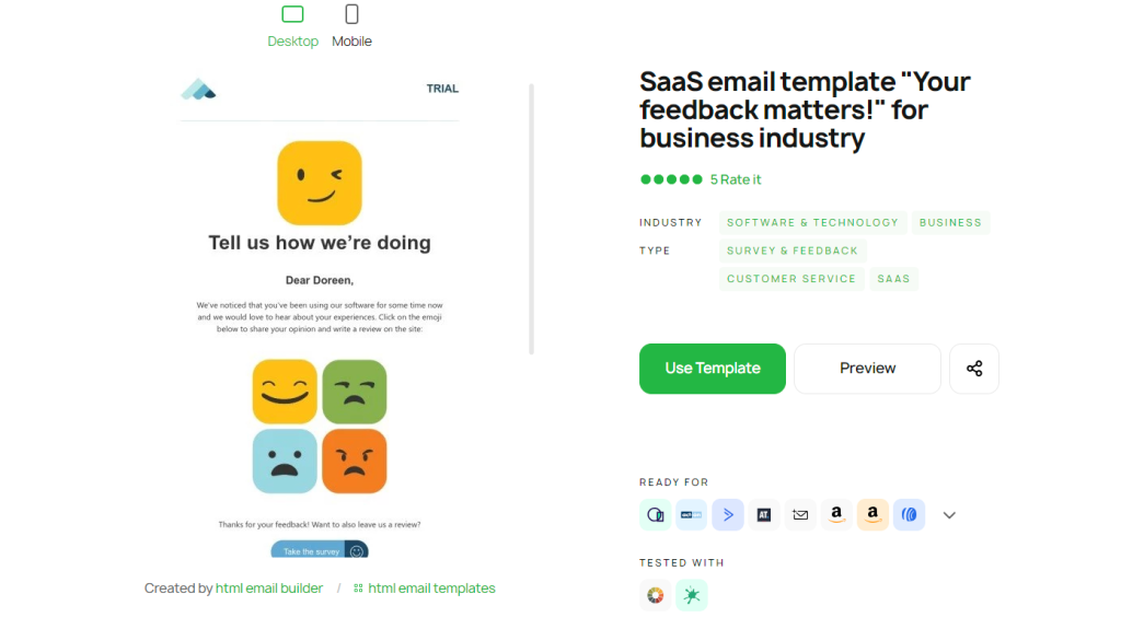 This template by Stripo is designed to solicit customer input and generate reviews – one of the best ways to convince other customers your business is useful. It encourages recipients to share their thoughts about your business.